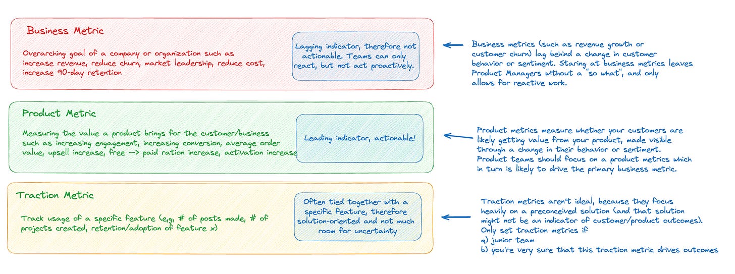 PMs should be able to identify the most important product metric(s) that reflect a change in user behavior or sentiment and have a high likelihood of driving the company’s business goal. When delivering solutions or features, they should check whether they have indeed managed to move both their product goal (leading indicator) and ultimately the business goal (lagging indicator):