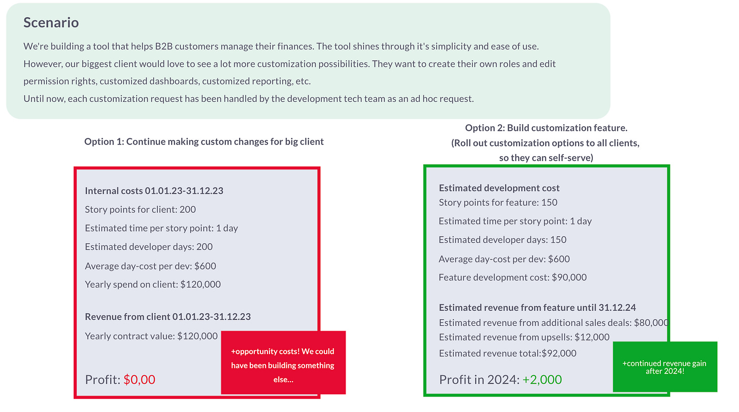 If you have an approximation for the cost of one sprint, it’s an easy starting point for your calculation. But don’t forget to factor in maintenance and go-to-market costs when truly comprehending the cost of bringing a new feature to market.