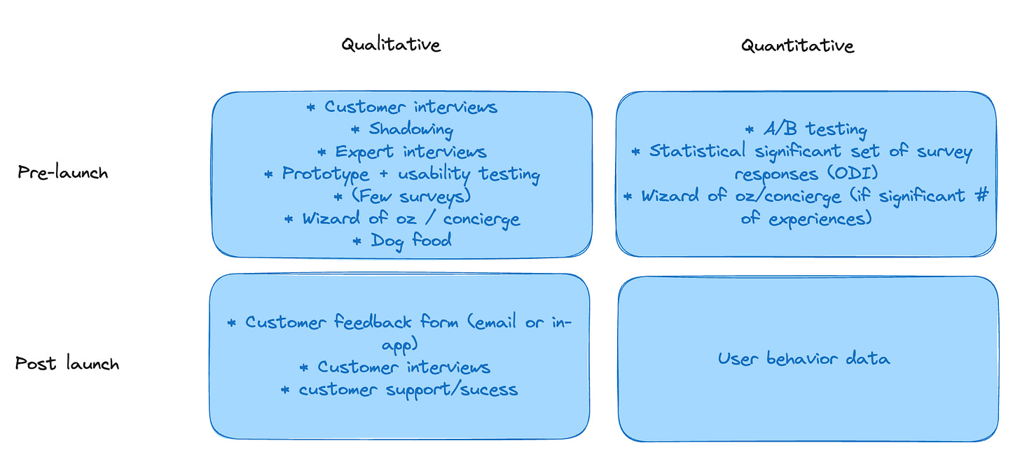 Although A/B testing is often considered the “gold standard” of testing, PMs have a wide variety of test methods at their fingertips when trying to de-risk or validate an idea. A good PM can select the right test method based on the circumstances, set up the test — including setting feasible success metrics — read the results, and understand why a test failed or passed: