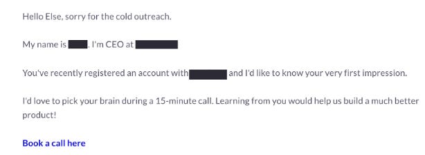 Kathy sends a beautifully worded email campaign, explaining how this interview would help her so very much, expressing her undying gratitude for even opening the email, and, of course, her email scheduling link.