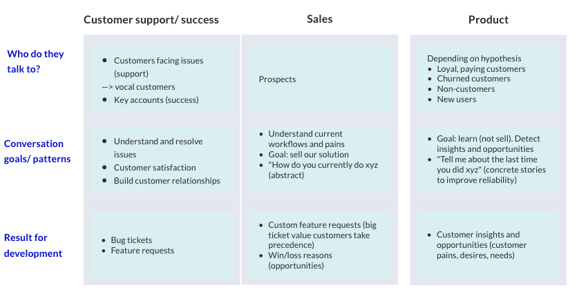 But the way product managers and researchers talk to customers is different from the way sales or customer support agents do.